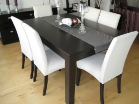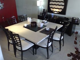 Tenemos todo tipo de telas y pieles tanto artificiales como sintéticas para decorar las sillas y materiales como mármol, gratino y más para complementar la mesa o los trinchadores